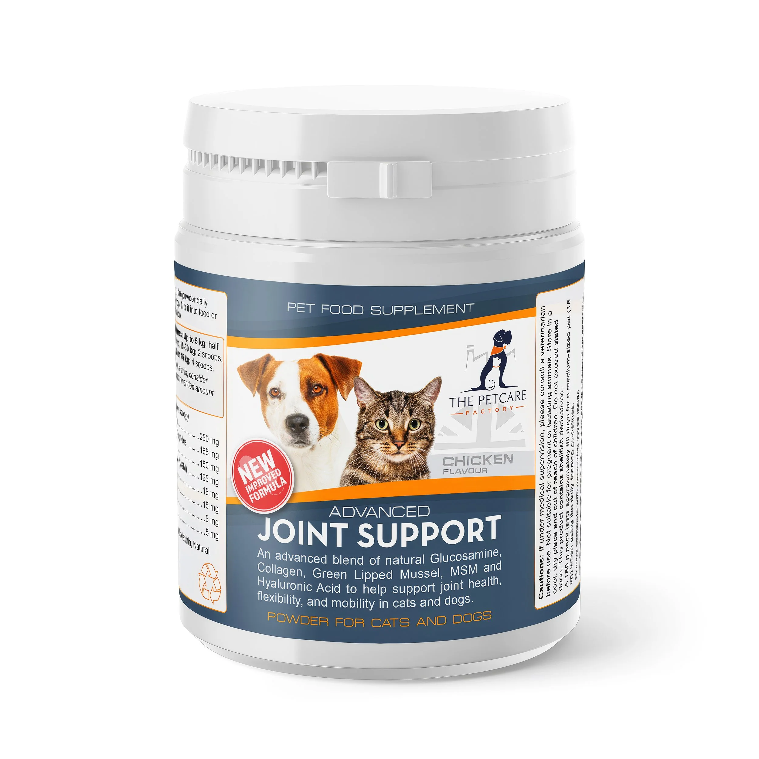 Advanced Joint Support from The Petcare Factory is a natural and organic supplement that provides comprehensive joint support for dogs and cats. Our unique blend of ingredients includes Glucosamine, Chondroitin, MSM, and Green-Lipped Mussel, which are known to be effective in supporting joint health. These ingredients work together to improve mobility and reduce joint inflammation, helping your pet stay active and pain-free. Our supplement is made from high-quality ingredients, is GMP-certified, and is easy to administer. It's also free from artificial preservatives, colours, and flavours, making it safe for pets of all ages. Give your pet the support they need with Advanced Joint Support from The Petcare Factory.